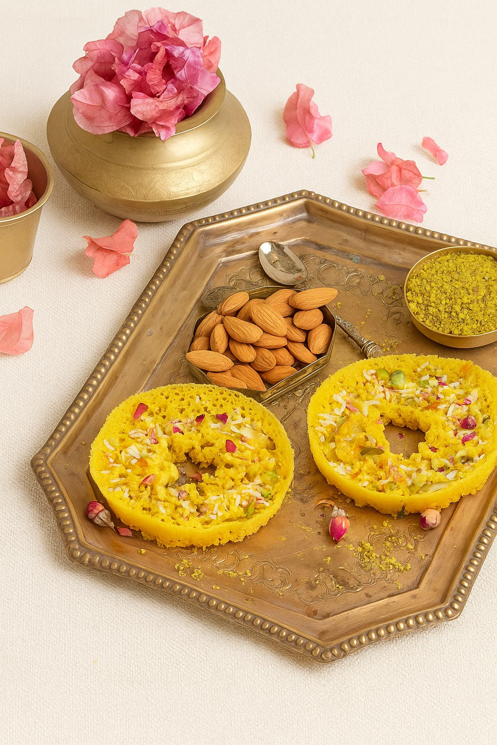 Plain Ghewar is a traditional Indian sweet known for its crisp texture and delicate honeycomb pattern. Made with a simple batter of flour, ghee, and sugar syrup, it offers a perfect balance of sweetness and richness. Ideal for festive occasions, this delicacy pairs well with rabri or can be enjoyed on its own, delivering an authentic taste of Indian heritage with every bite.